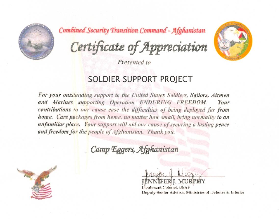 I just received a Certificate of Appreciation from a Airforce Capt. I send him care packages that he hands out to all at Camp Eggers. The are a a combined Security Transit Unit in Afghanistan.