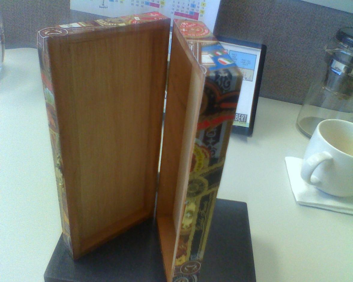 Holds 3 cigars, 56RG x 6" Something for him to pop a few smokes in when he steps out....he usually uses a ziploc bag. Ah to be 25 again! Lousy lighting in my office....
