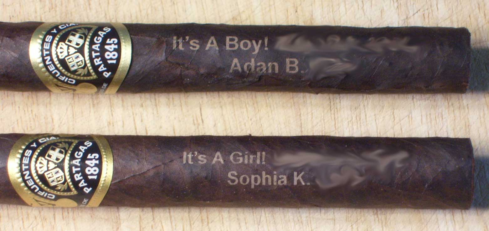 Here is a photo of a pair of birth announcement cigars engraved by Corona Cigars and sent to me by a BOTL from another board. (I digitally obscured the last name and birth dates for privacy concerns.)