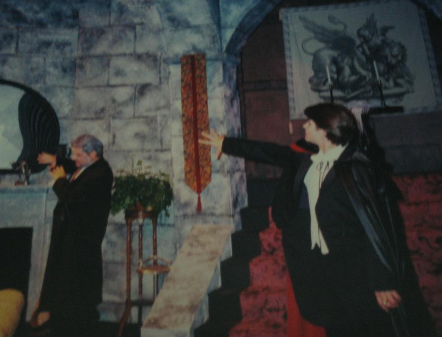 She was blonde and hot. This was in South Alabama, so you know they had a lot of young blondes to choose from. There must have been 20 in this show. I played a real FOP, and you can see how bad it was, the guy in this photo is as straight as me, but a better actor, lol. Second seris is from Dracula, I played Von Helsing, onstage the whole show except for a 1.5 page quick change. Brutal show, but my best role ever. I showed up late to the tryouts and the director had stated unequivocally that there we would NOT be doing accents in the Dracula part. So of course, I get up and read in a crackerjack Bela Lugosi....GREAT, but totally F'ed up. Always come on time, lol. Tried out for the lead, but I was not handsome and slim like Drac had to be, found out that I DID get the lead, and it was V.H, lol. Forgive me, I just shot these pics with a camera on my keyboard in dim light, but they are plenty scary no matter. Want BAD LUCK?? We had to have Dracula break a mirror every night, in an effort to have me NOT see that I could not see him in the mirror. He would shoot a flash paper shot out of his sleeve and the mirror would be broken back stage with a large pointed steel bolt On this night, he made his flourish, fire shot out and then nothing for 10 secs..... Then crack. The audience BUSTED out laughing, as we both stood there as if to say "WAIT for IT!" Last edited by OLS; 05-28-2011 at 09:48 PM. |