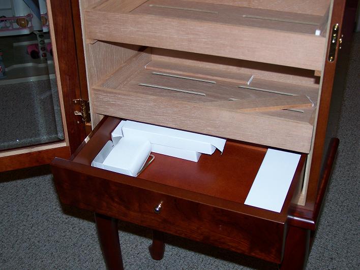 .in my previous thread I had asked for some advice and people asked me where I got this monster and to report when I got it. Let me just say that for a 600ct Humi that was supposed to retail for over $600 that getting it on sale for $150 I was a little skeptical....especially since I had not done any business with this firm before. I ordered it on Thursday, got the tracking number on Friday, and recieved it at my door Monday (shipped $36). It weighs about 55lbs and all you have to do is put the legs on. It has a removable hygrometer (as most do) and 3 large rectangle humidifiers for your di water...even has a built in lock and key (for those of you that have kids). I am very please with the overall quality. It has 3 drawers that are deep, easily fits a few boxes and you can stack a few high as well, has dividers, all spanish cedar lined, and a drawer on the bottom to keep any of your cigar accessories. I researched and I could not find another fancier looking humi that your "fit in" with furniture...this does the job well...now on to filling it up!http://www.cigartoyz.com/_e/DISPLAY_...sive_Sale_.htm |