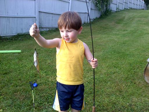 As a lot of you guys know, I enjoy the fact that we live on a lake. Today I had a lot of s**t to do but in the afternoon, my friend Chris, my son and I walked to the edge of our property and threw some lines in the water. My boy is 2 and 1/2 and is simply put, my entire world, my entire life and I would give my life in a heartbeat for him, I love him so much. Well, he wanted to fish with us so I figured it was time to show him the ropes and wouldn't you know, the young man got himself a fish! Not the biggest or the baddest, but I cried like a fat man during closing time at the buffet when he landed his first "sunny". Of course he said "Dad, look; a Tuna!".