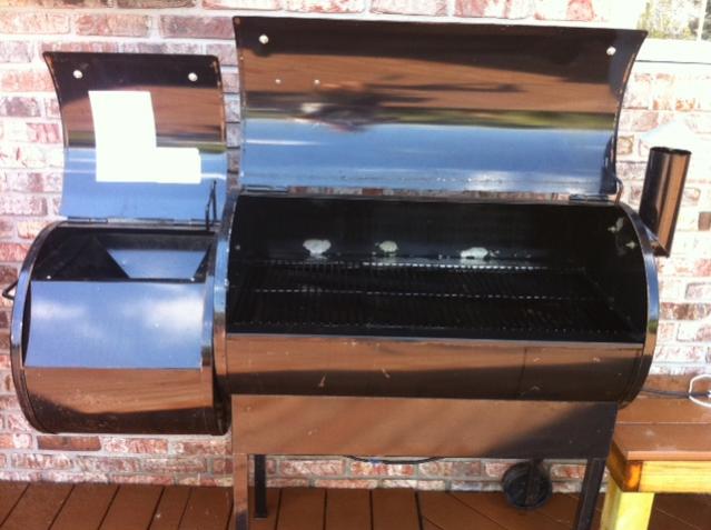 Pics while I'm at it...I think a pretty good deal for $350 for a Texan. Have to get my own grease bucket and will upgrade to the digital thermostat, but other than that, she's ready to roll. I did have 1 screw up moving it to the deck as I had the bin on the mower, I ran over the cord and it snapped. I grabbed a 10' extension and just spliced it in as I would have needed an extension cord anyway to get to the outlet on the deck.