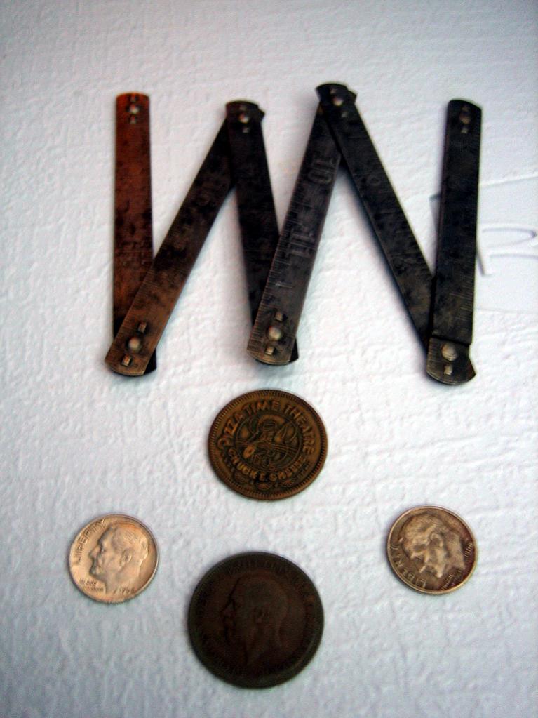 a 1968 dime, a Chuck E. Cheese token, a russian coin of some kind and a stainless steel folding ruler.