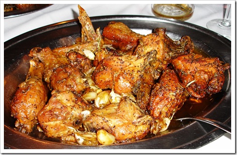 that this is one of the most delicious dishes you can find in the world. A classic Italian flavor without being an Italian Classic. If you do this right, you will want to add it to your bachelor list of dishes you can whip up at any time without looking at a reference. It's that easy. Or is it?? First thing that separates the cigar smokers who like to dabble in recipes from the chefs who can do it all is the skillet. Do you have a LARGE cast aluminum or cast iron skillet OVER 12 inches across. 18? 15? Do you have a range that can BLAST that thing into the stratosphere? It's all about size and heat with this dish. OK, take a chicken and cut it up into about 10-15 pieces. The real recipe calls for 3 lbs of chicken, but we are gonna cut it down a bit to fit and to make it manageable. a chicken 1/2 cup of olive oil 3/4 cup of dry white wine 10 garlic cloves mashed 1 teaspoon oregano 1 teaspoon rosemary half teaspoon kosher salt half teaspoon fresh black pepper Heat your olive oil good and hot. Olive oil is not as durable as peanut oil, but you want to get it hot first. Take your chicken and brown it thoroughly in the pan. When it is completely browned, sprinkle with salt and pepper. Sprinkle salt and pepper on chicken. Add mashed garlic, oregano, rosemary, and stir well, so that all seasonings are evenly evenly. Pour in the wine, simmer until wine reduced by 2/3 . Serve hot with plenty of pan juices. I like to also make up some Spaghetti Bordellaise to pour this all over. Just take some Spaghettini, the thin spaghetti, and cook it up right. Add butter, garlic and olive oil according to whatever recipe you find or prefer. Also works extremely well with bird nest pasta. If you make this and even get it halfway right, you will love it. I like to finish this in the oven under the broiler, or ever do it all in the broiler, stirring about every ten minutes for 45 minutes total cook time. But that takes the right pan, I guess. The most important thing about the dish is getting the heat right and not crowding the chicken. Olive oil may have a low smoke point, but this one really challenges that notion to some extent. GET IT HOT. |