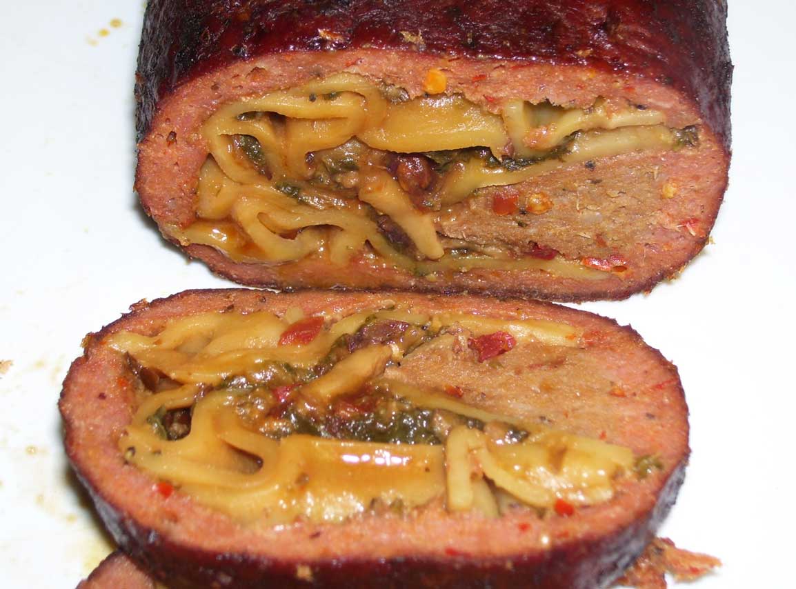 Now, retrospect, despite the fact I'm not a big cheese guy - I mean, I like it, but short of pizza, not in large quantities; I must say I used way too little cheese on this one. The blue cheese worked great for the flavors, no question, the flavor was there, but there was no texture, and this needed a texture of melted cheese, so a mozzarella or other mild cheese would have been good here, so as not to clash with the blue cheese. Oh, and more sun dried tomatoes would have been great too.