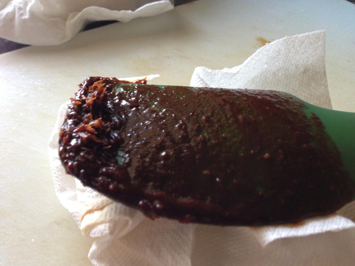 Decided to give some dried chiles a try. Soaked 6 whole anchos in some hot water for 30 mins, including all the seeds and stems. Once rehydrated, into the blender jar with some of the soaking water. Started on low, let it go for a bit and went to a medium speed. Once all the big chunks were broken up, I let it rip on high. Blended for a total of maybe 1.5 mins. Then ran the purée thru my medium mesh sieve. This was all that was left. The purée is quite smooth.