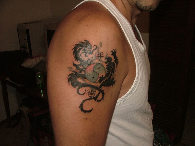 Right arm: Tribal Tiger (my chinese zodiac sign) and a tribal Dragon (my wife's sign) circling around a ying yang with Kanji above and below (Harmony and Balance)