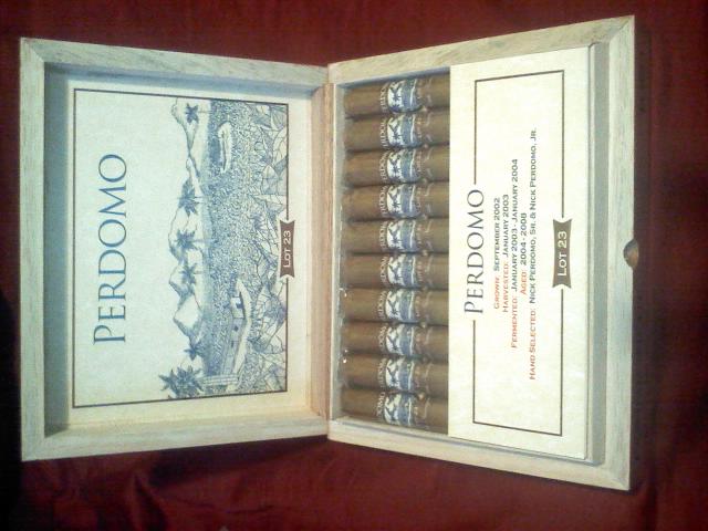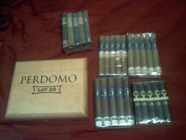 The first pic is of my whole haul. The second is of the Padilla Single Batch Sampler, including some 2009 Edicion Limitada Miamis that I am particularly excited about. The third is my 5 Vegas box-pressed sampler. The fourth; my first ever box purchase! Perdomo Lot 23's, my favorites. The fifth is obviously that box, just opened. |