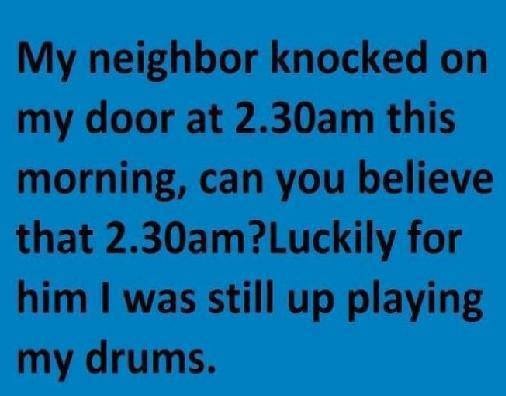 My neighbor came by my house this morning at 2AM, pounding on the door. Good thing I was still up playing the drums.