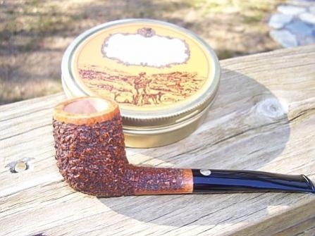 Waiting on a 4noggins bulk order: 8 oz Down by the River, 4 oz Covered Bridges, 4 oz Weybridge. Just received an order from RYOcigarette: 3 50g tins SG Golden Glow and a no-name Italian bent billiard.