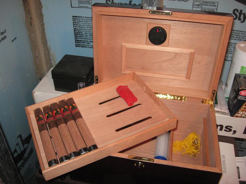 pauly, nice humidor....but trust me when i tell you this...get a bigger humidor and fast..you'll need it when u get a bargain on a bunch of cigars and need someplace to store them...I good sized humidor can be had for cheap...just make sure you check the WTS forum..also CI has a pretty good one that I got for a reasonable price..it's a 300 capacity desktop humidor that i got for around a $100 or so...it's called the "diablo"