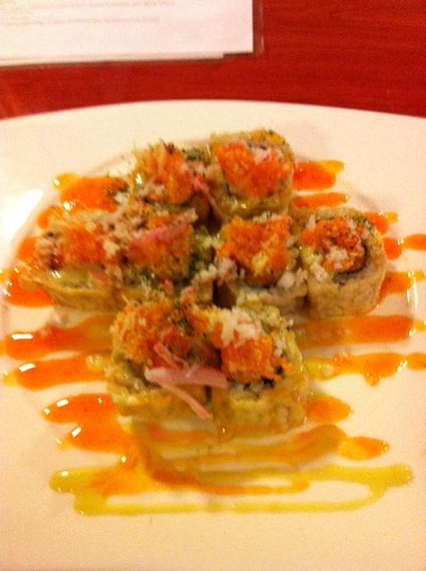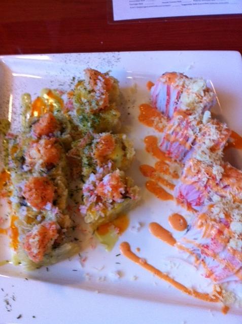On the plate with 2 rolls, the one on the left has jalapenos in it with a bit of sweet sauce. The jalapenos were so overpowering you couldn't taste anything else. I love me some wasabi and to the point it hurts, but jalapenos aren't my choice for heat, that's for sure.