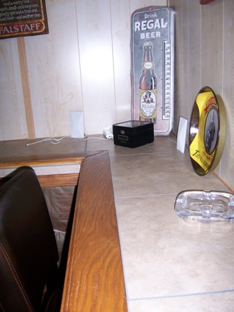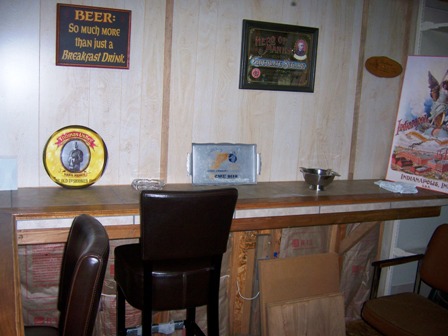 OK! Did some more work on the interior of the shed the last couple of weeks. I'm almost totally finished but still need to complete the wiring for the outlets and then finish up that last bit of paneling. But I finished my "bar" and got some decorations up and even have a small TV in there now! I had five guys in there last Sunday, for cigars, chili, and homebrew! Except for being a bit smokey it was pretty comfortable! Here are the latest pics!