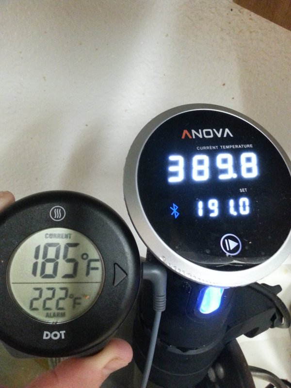 Put some country ribs (pork shoulder) in the tank about 5 hours ago, will pull them out tomorrow evening at somewhere around 34-36 hours. Currently running the bath at 140F, but debating if I want to raise it a bit.