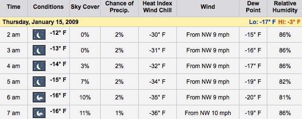 High today is going to be -2*F, with a low of -14*F (real temperature). Don't worry though, the cold snap is almost over. Friday we are up to a balmy 7*F.