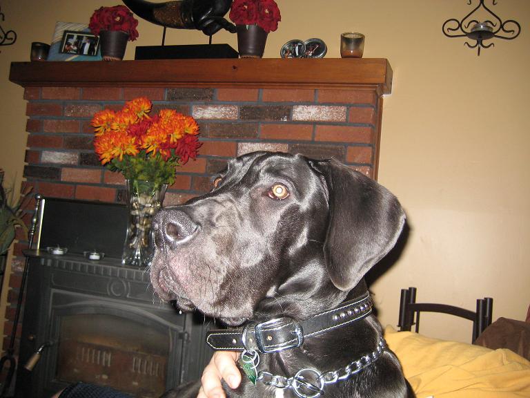 As of his last visit to the vet, Dante is now pushing the 100 pound mark at 7 months of age. He is such a loving dog, who just enjoys the company of people. He has successfully scared one pizza delivery guy (little did he know that his back end was wagging with excitement ), but as soon as he gets the ok from me, he's a big lovable goofball.