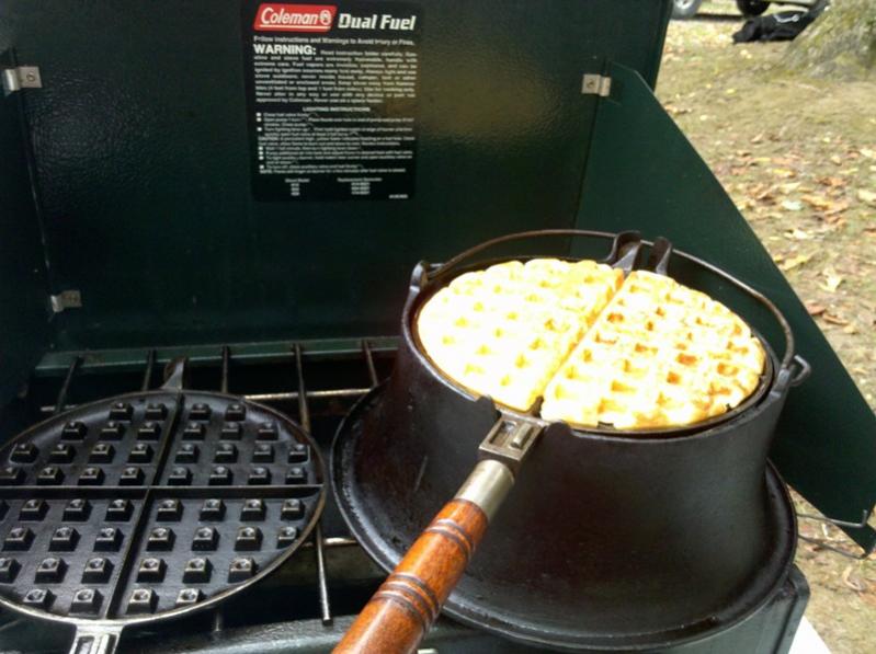 I also have a waffle maker that I just picked up last spring... this thing is great and makes the most perfect waffles that I have ever seen. Never sticks... it just works great on my little camp stove. This one has the high rise that the maker sits in. It's probably five inches or more above the burner to the actual waffle iron. Oh yea, I dated that waffle iron and found that it was made between 1910 and 1922.