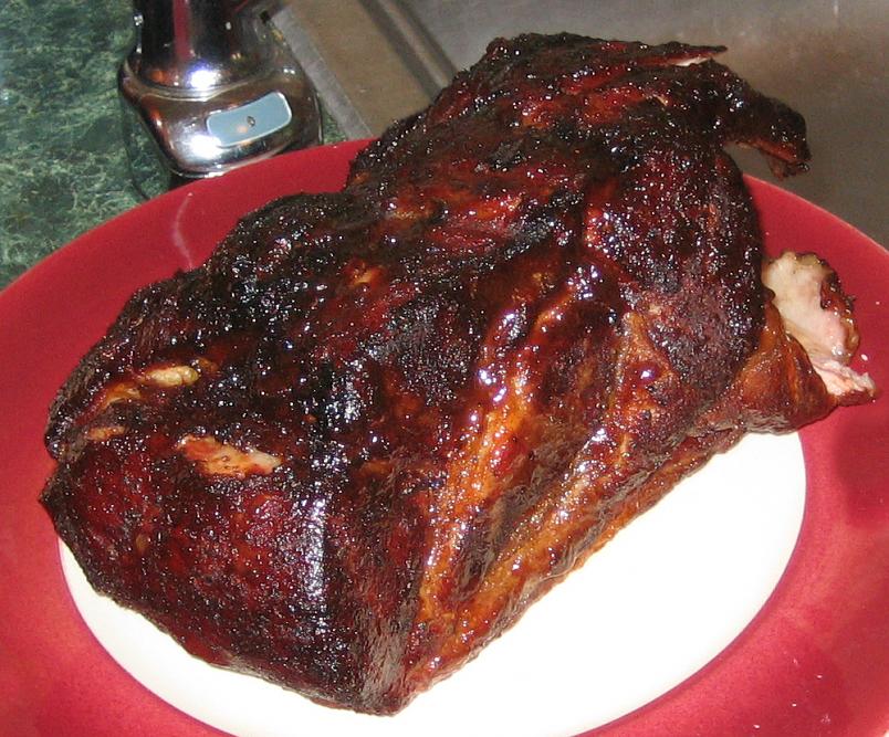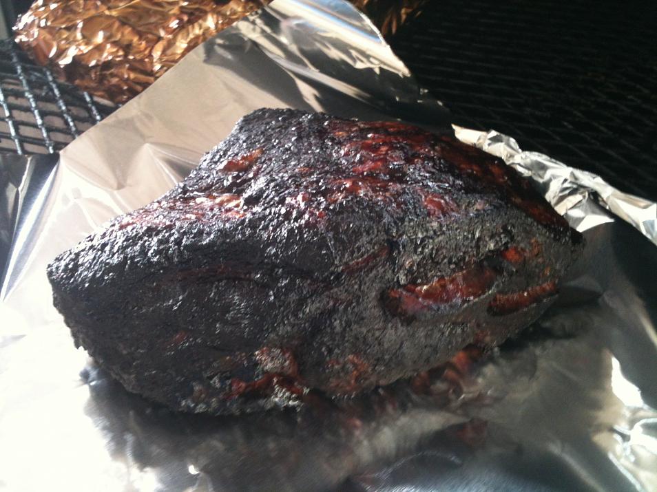 and took this photo.....it tastes great, too. Smoke, 2 hours, Foil, 1.25 hours, SBR sauce and