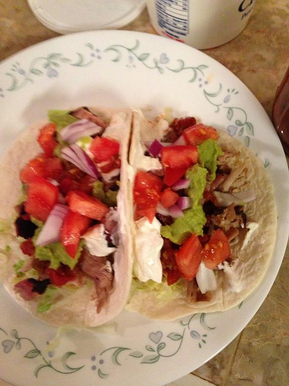 I wish I had gotten a shot of the chicken quarters we did. We tried something new with them today. Holly was going to marinade the leg quarters in a Mojo sauce we had hanging around in the fridge, but it had gone bad. She found some margarita mixer in there though and she mixed up some of that with some orange juice and we soaked the chicken in that for a couple of hours, then sprinkled some garlic and some onion powder over them as we put them into the smoker. 3.5 hours and boom! Awesome flavor. I let the firebox end of the smoker go up to around 250* (the pork and brisket were in the front) and it came out really well. Skin was crispy but not burn and the meat was melt in your mouth good.