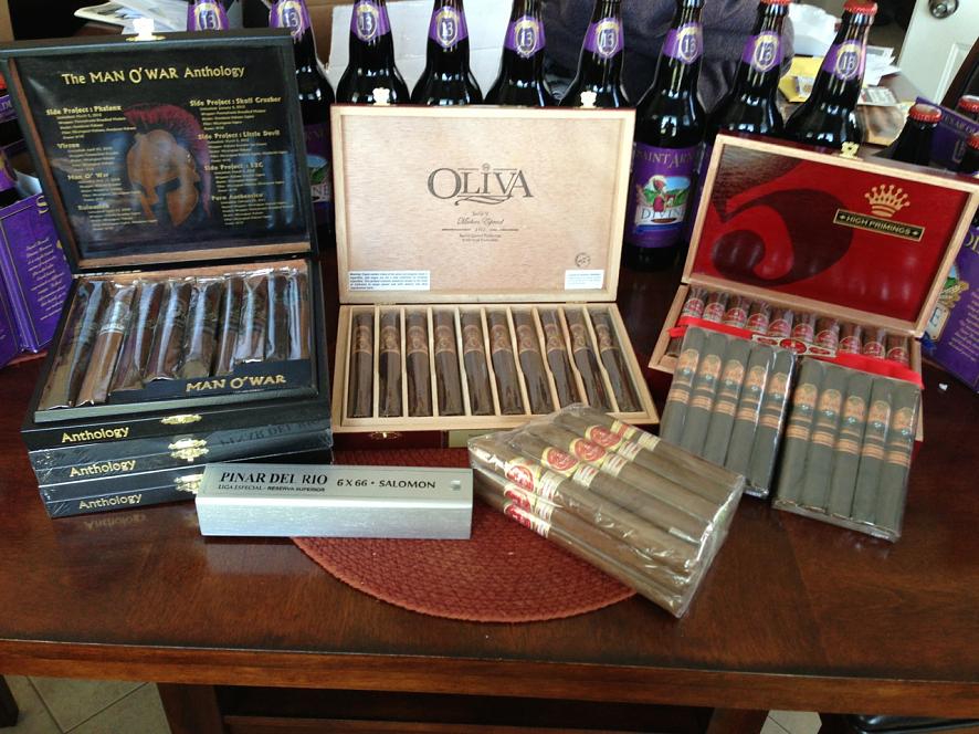 box of Oliva V Maduros box of 5 Vegas Classic High Primings with free 15 count flight sampler 10-pack Toraņo Exodus 1959 50 Years one coffin PDR Salomon. |