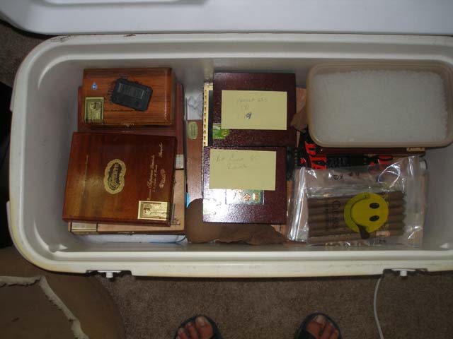 Ok so here are some pics of my humis. The 150 count is currently empty as I have been smoking done my singles while I have been buying boxes. The 10 count I use as a "dry box".Then there is the cooler. One of these days.....