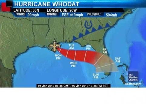 Hurricane WhoDat is predicted to make landfall on the South Florida coast in the vicinity of Miami on 7 Feb 2010 at approximately 5:00 PM CST. This extremely powerful hurricane is expected to produce damaging Shockey waves and Category 5 Brees.