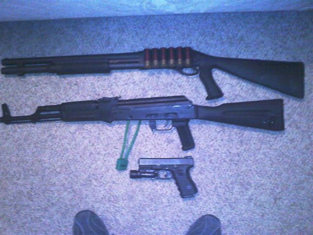 Remington 870, WASR-10 AK-47 that I tweaked a bit, Glock 19. My old reliables Sorry about the crappy pics. All I've got right now is my camera phone