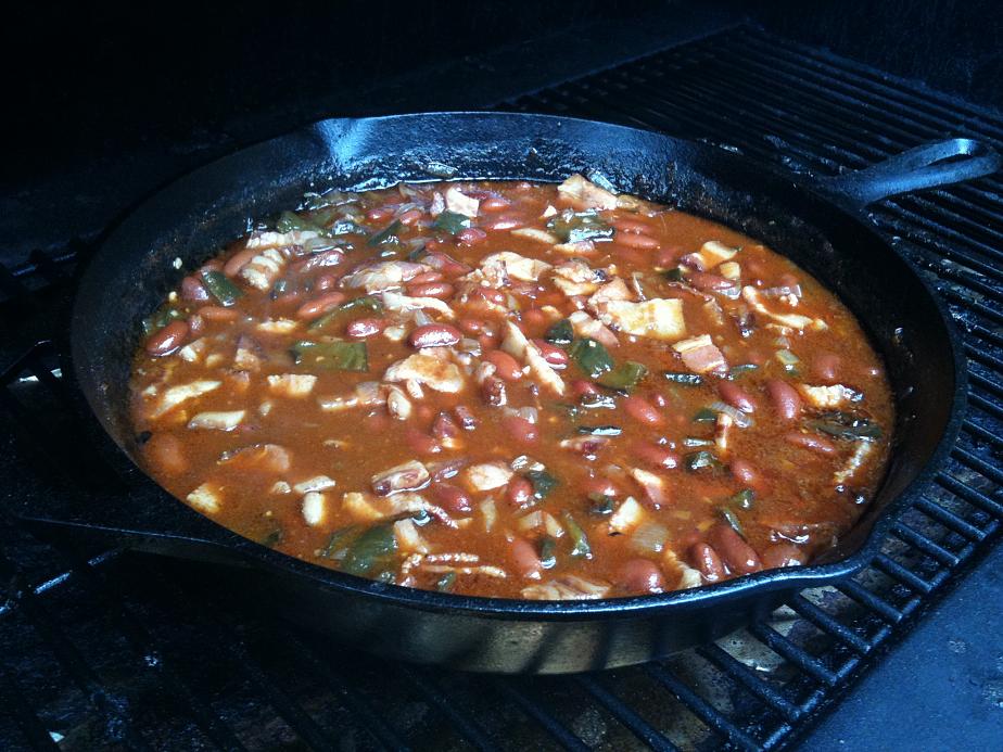 On the smoker at 4PM/PST is 3.55 lbs of Tri Tip in a new type of rub and a batch of smoked BBQ beans. Using Hickory chips today: