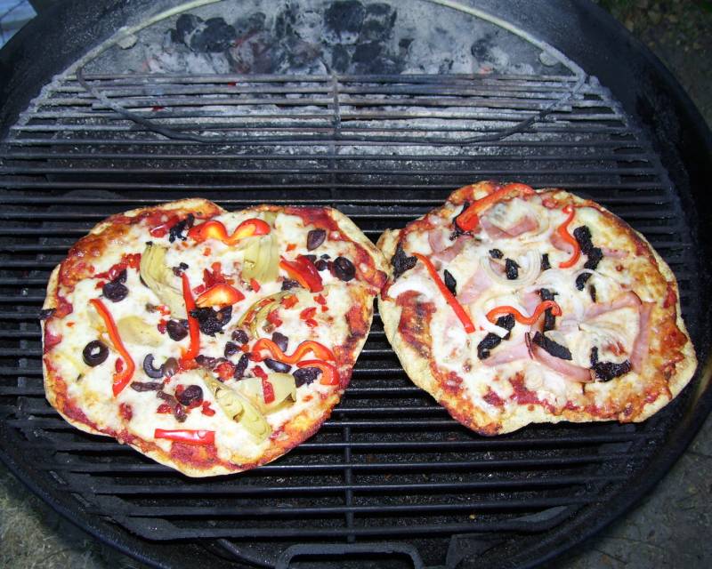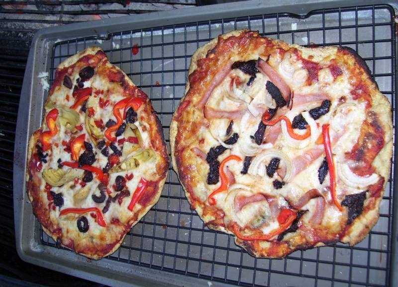 Made a few more pizzas last night, hand tossed dough seared in a pan (comal) before loading it up and taking it out to the smoker. Cook for about 20 minutes at 400-450 then remove the lid to the smoker and move the pizzas over the coals to burn the bottoms a bit. The last part only takes a few seconds, so you have to keep them moving.