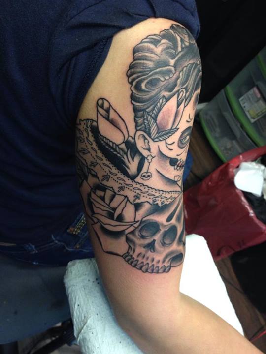 Wife got some new ink today. This piece took about 3.5hrs to get to this point, and it took the tattoo artist about 2hrs to draw it up from scratch. Once it heals, it's getting color.