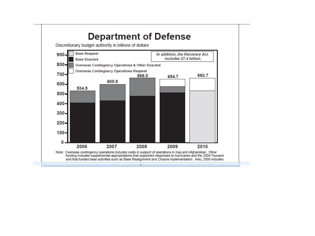 • Provides $533.7 billion for the Department of Defense base budget in 2010, a four-percent