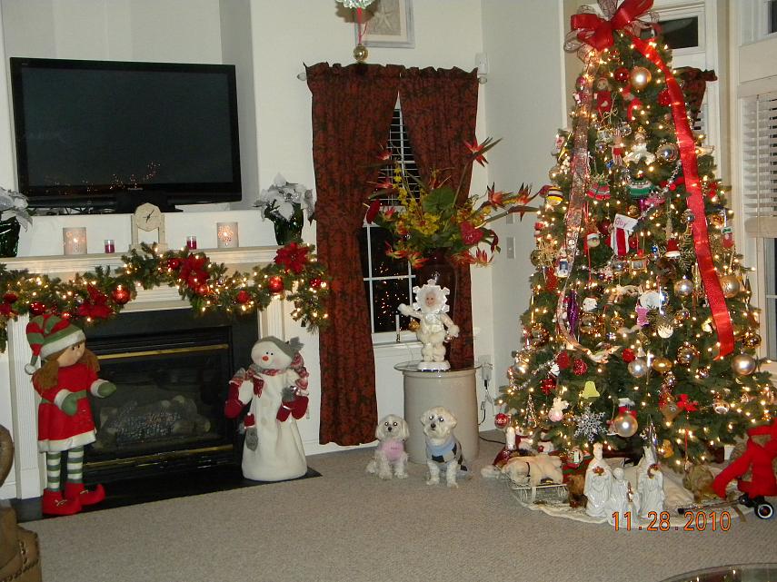 I have to say up front my contribution consisted of lugging the tree and other stuff up from the basement, putting the tree together and hanging ornaments. Sandi and my son did the outside. We did this the day after Thanksgiving, I just got around to taking pics.