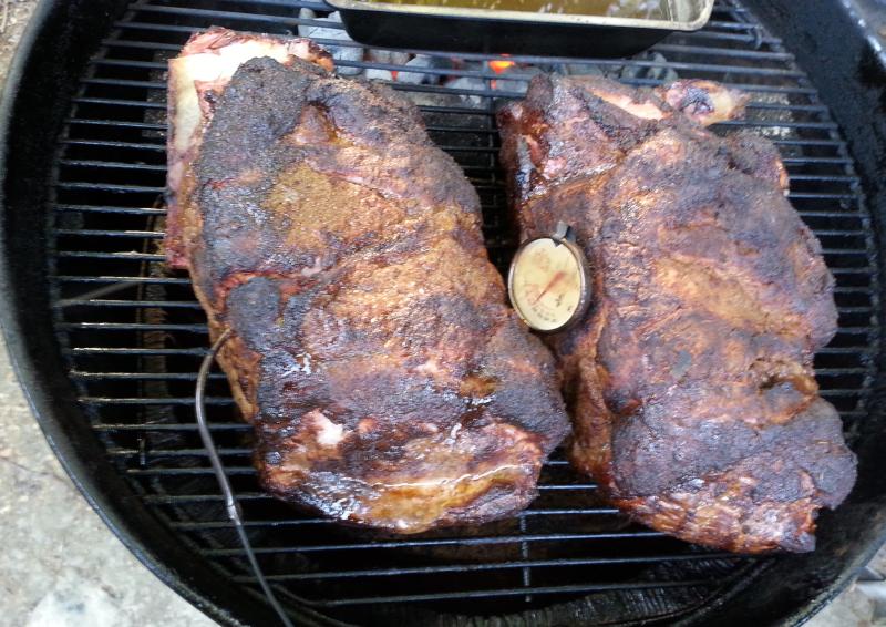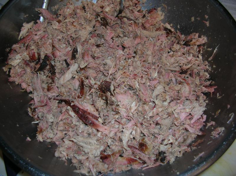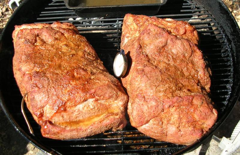 A few comments/notes from me: - I recommend kosher salt (Diamond Crystal), as it's "less salty" per volume versus sea salt. You can always add salt at service time, you can never take it away. - I use granulated (the stuff with the texture of sand not the fine powder) rather than flakes for the garlic and onion, seems to form a better, albeit 2-dimensional, bark. - To prevent clumping, dry the brown sugar by spreading it out on a sheet pan (cookie sheet) and put it in the oven at the lowest temp setting with the door cracked. Takes about 20 minutes, stir it once or twice. Let it cool, break up any lumps and add to rub. - You can easily customize the flavor of this base rub by going up or down on the garlic, cayenne, onion, salt or adding things like ground cumin, thyme, rosemary, mace, oregano, marjoram, ground bay leaf, dry worcestershire powder, etc. With the exception of cumin, go easy though (like 1/8 to 1/4 tsp per cup of rub) as they really come through. I grind the leaf spices in either a whirly blade coffee grinder or a mortar, depends on how much I'm adding. - If you're not afraid of it and have it around, a 1/2TBS of MSG (Accent) or 1TBS of dry soy sauce powder per cup of rub will boost it up quite a bit. Buy a big shoulder and coat the heck out of it, you're going to shred it, so having a thick layer of rub on a piece of meat that's 8" thick isn't a big deal. Save a little bit of rub too, sprinkle it in when you shred and toss the pork. And, don't worry, pork shoulders / boston butts are very forgiving. About 1.5 hours per lb at 225-250F, look for an internal temp of 180-185, pull it off, wrap in foil let it sit for an hour or two wrapped in towels or in a empty ice chest. Throw it in a bowl and shred it. If it's too dry, toss a stick of butter in along with some water. |