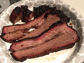Did a small brisket (5.5lbs trimmed). 4hrs@225 high smoke, 3.5hrs@275 to an internal temp of 202, rested about 1.5hrs till internal temp got down to 170, then into 155 oven to rest for 4 hours. Tender, juicy, super tasty. The pic doesn’t do it justice as to how juicy it was.