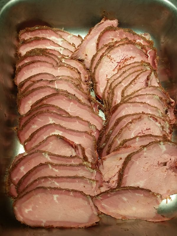 Beef eye of round. Covered in spicy rub, smoke setting on the pellet grill for 2 hours, bagged up and SV for 12 hours at 134F. Chilled overnight in the refrigerator, moved to the freezer for an hour or so before running it through the meat slicer this morning. Almost no juice in the bag or shed when slicing.