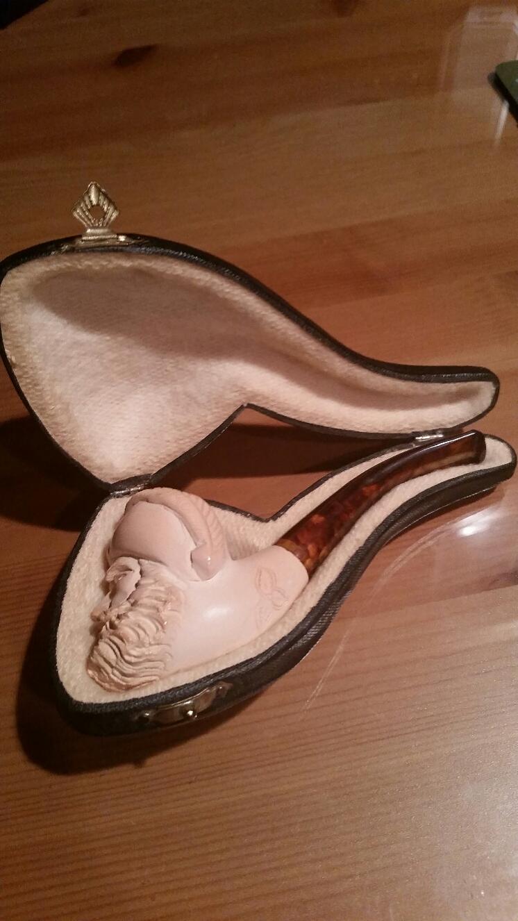 An estate meerschaum won on *Bay from Pipestuds offering. Bowl HT 2 1/2" x L 6 1/4": ![]() ![]() ![]() Need to get it cleaned up, sanitized, and then we'll move forwards and re-break it in...