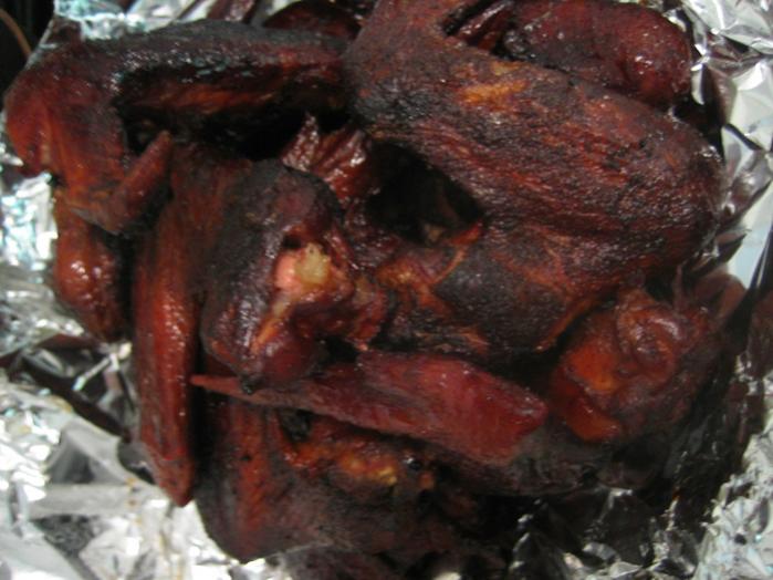 that did that. But I have taken to smoking first for about 90 mins at 200 and then when the smoke dies down, I stoke the coals again and let em roast for an hour around 250 then I just let the heat die out for another hour and pull em, provided the meat has shrunk off the bone ends enough to suit me. |