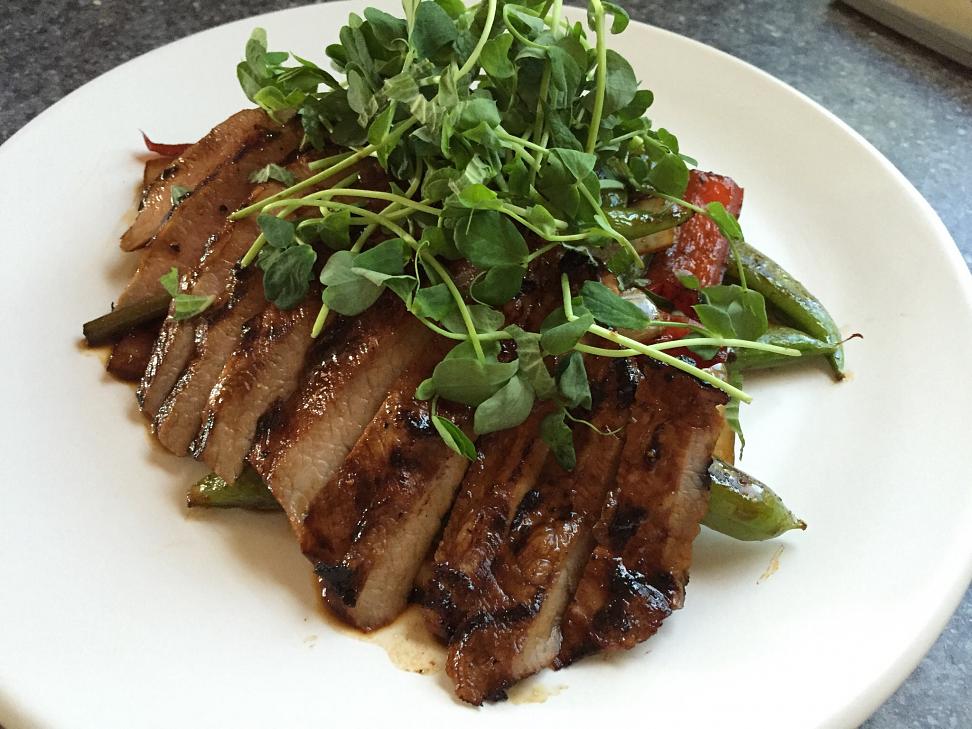 Gochujang glazed, grilled lamb flank steak over stir fried sugar snap peas, onion, red bell pepper and pickled garlic scapes. Pea shoots and chopped mint.