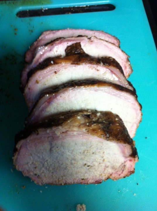 Here's my first loin off the grill. I pretty much did this without a thermometer cuz the one I have is pretty much junk. 2 loins around 4.5 # each were on about 2h45m right round 225 give or take for the most part. Very moist and good smoke flavor.
